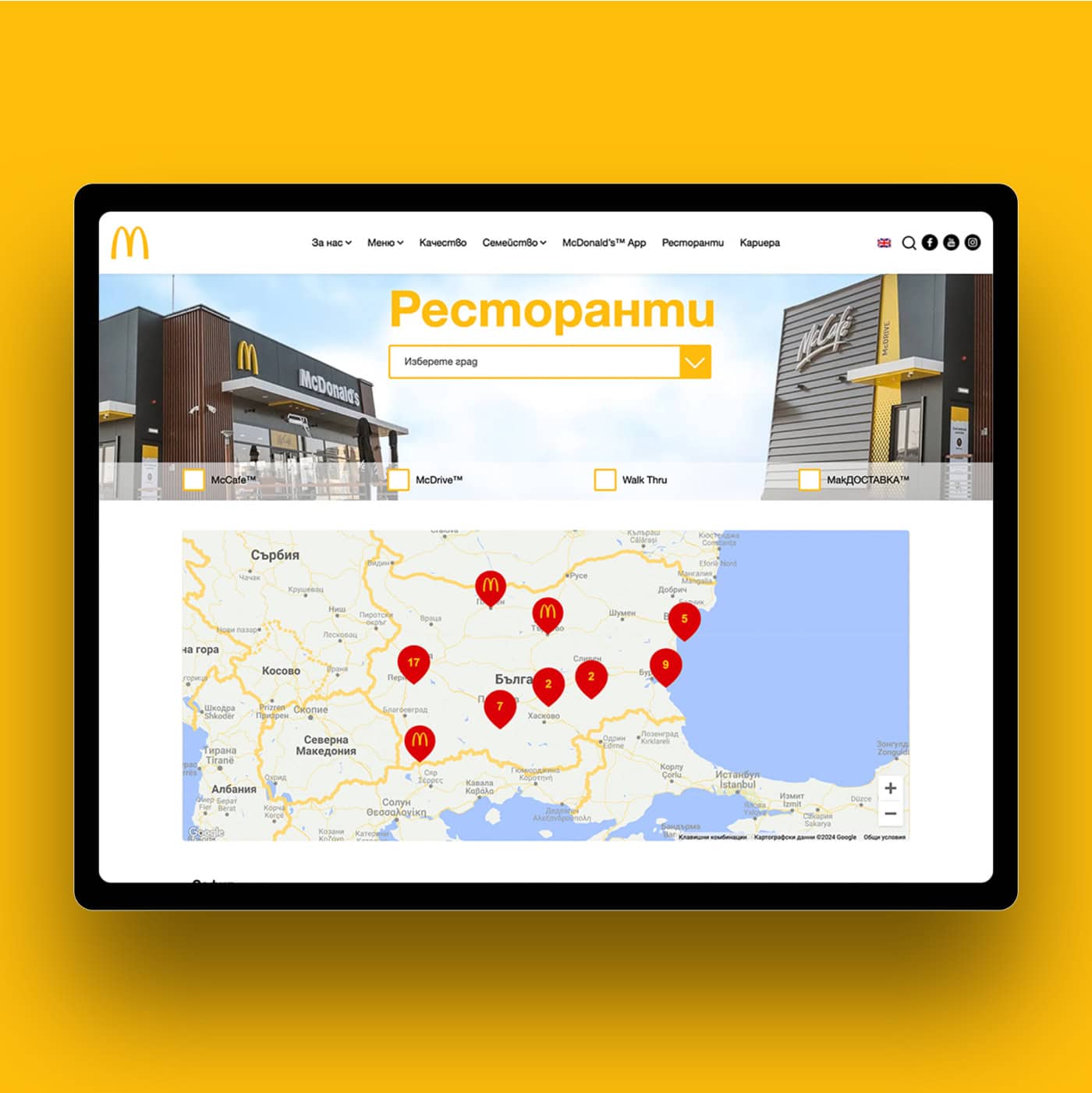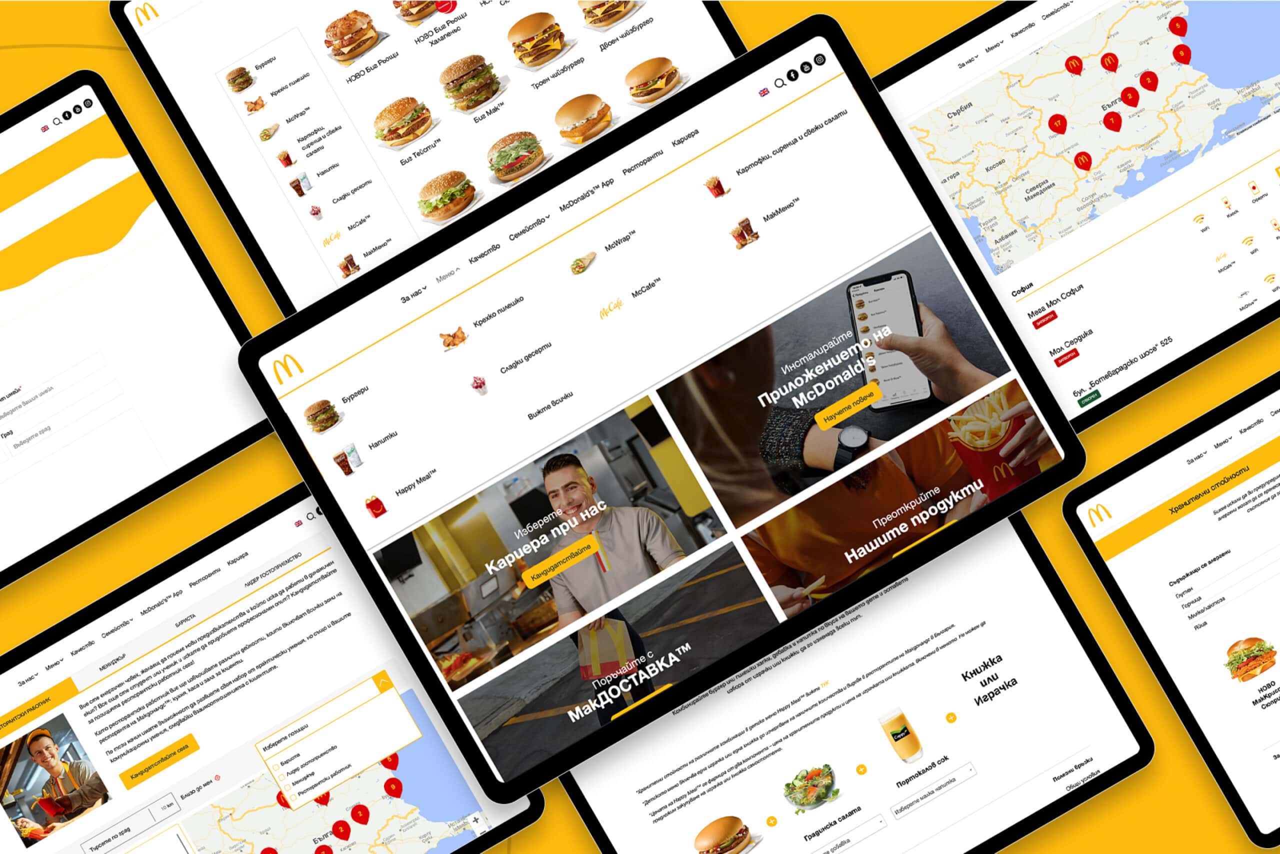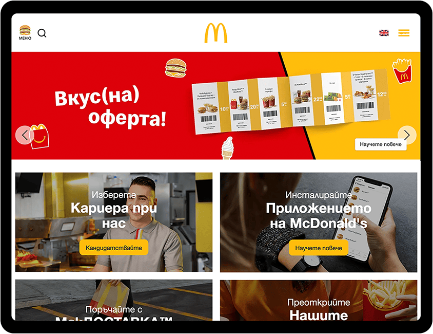McDonald’s Bulgaria wanted a website that offers users an engaging way to explore the brand’s menu, find nearby restaurants, and discover career opportunities. The goal was to create a platform that combines brand consistency with user-friendly interactivity.