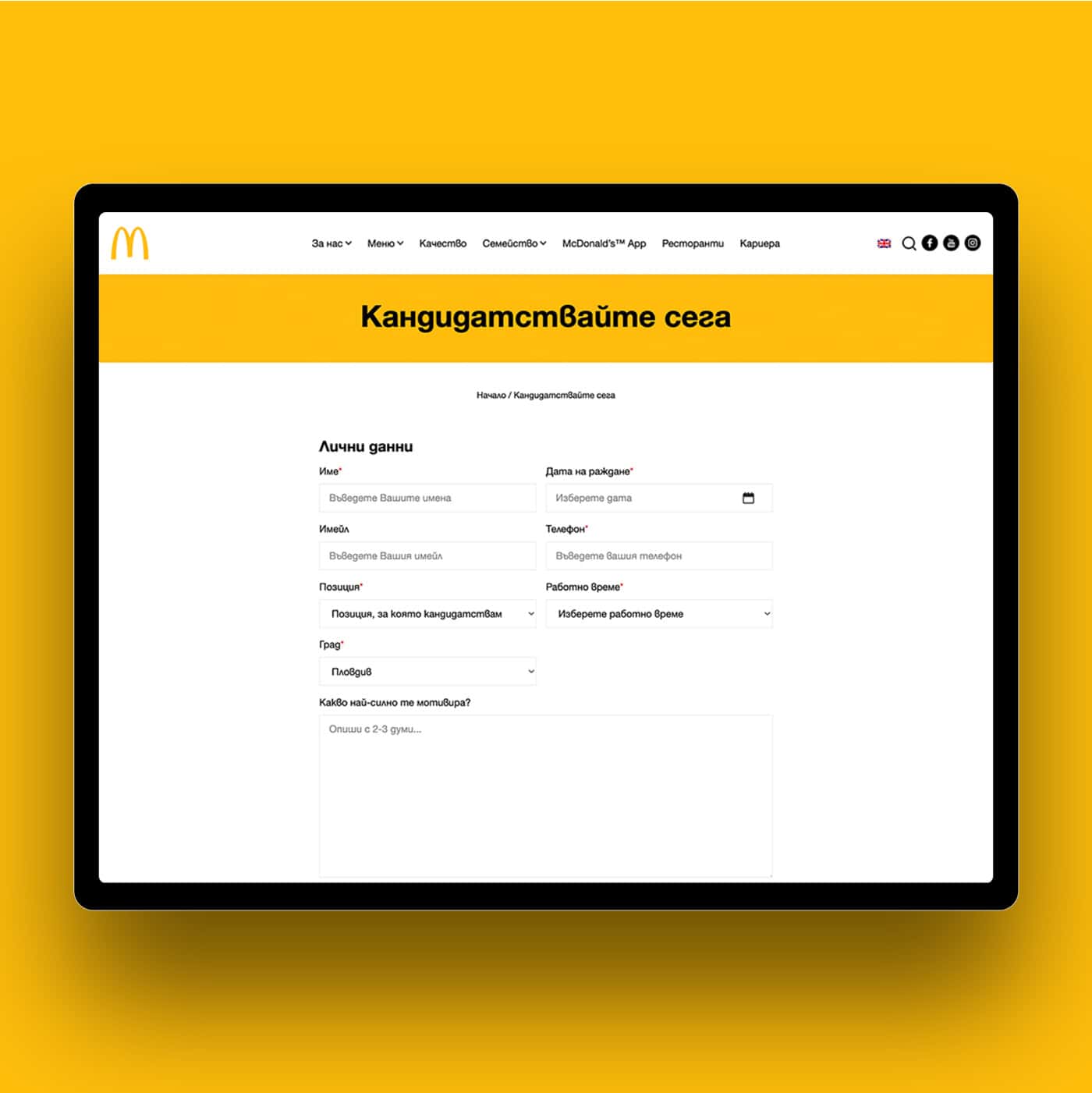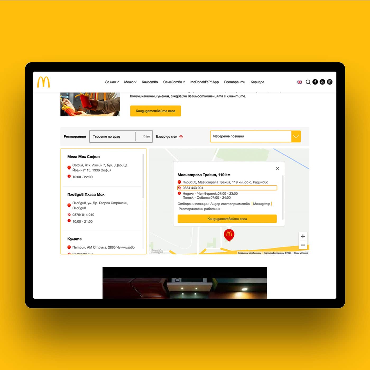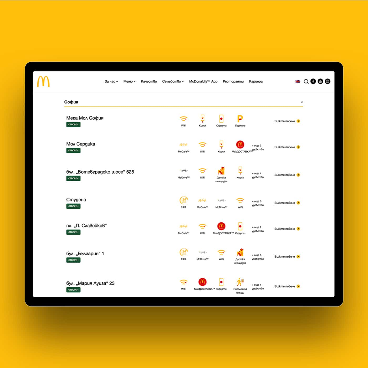 McDonald’s Bulgaria wanted a website that offers users an engaging way to explore the brand’s menu, find nearby restaurants, and discover career opportunities. The goal was to create a platform that combines brand consistency with user-friendly interactivity.